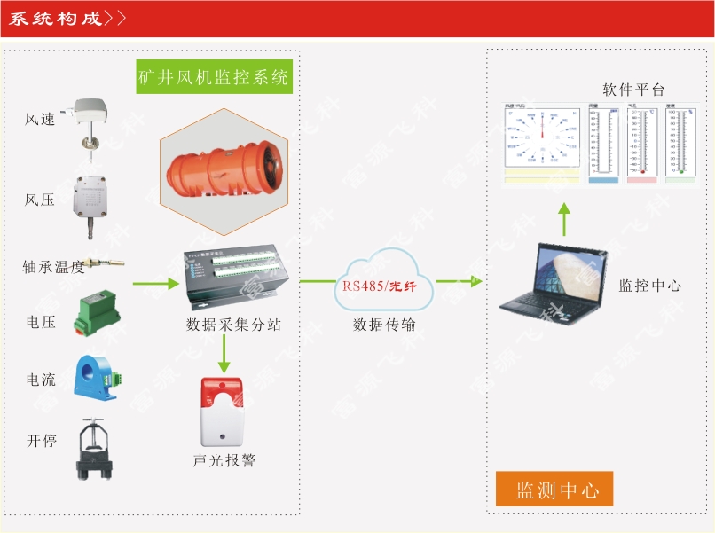 FY-KJ300煤礦井主通風機監測系統的設計是以《煤礦安全規程》為依據,對煤礦井下實際情況進行考察之后,綜合各方面的要求設計出來的,監控設備的種類、數量、性能符合《煤礦安全規程》的有關規定,適用各類大中小型煤礦。該系統可采集風速、溫度、甲烷、風量、振幅等性能參數,以及設備開停、供電狀態等生產參數,是煤礦安全生產的必備設備。