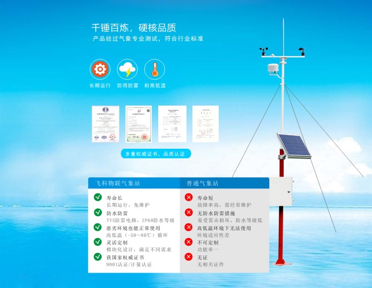 FY-QX-350型自動(dòng)氣象站,采用3.5米氣象觀測支架,是針對氣溫、相對濕度、土壤溫度、土壤濕度、雨量、蒸發(fā)、風(fēng)速、風(fēng)向、氣壓、太陽總輻射、光照度、二氧化碳等氣象要素的觀測而設(shè)計(jì)的一款智能化、可配置、高性能自動(dòng)觀測站。