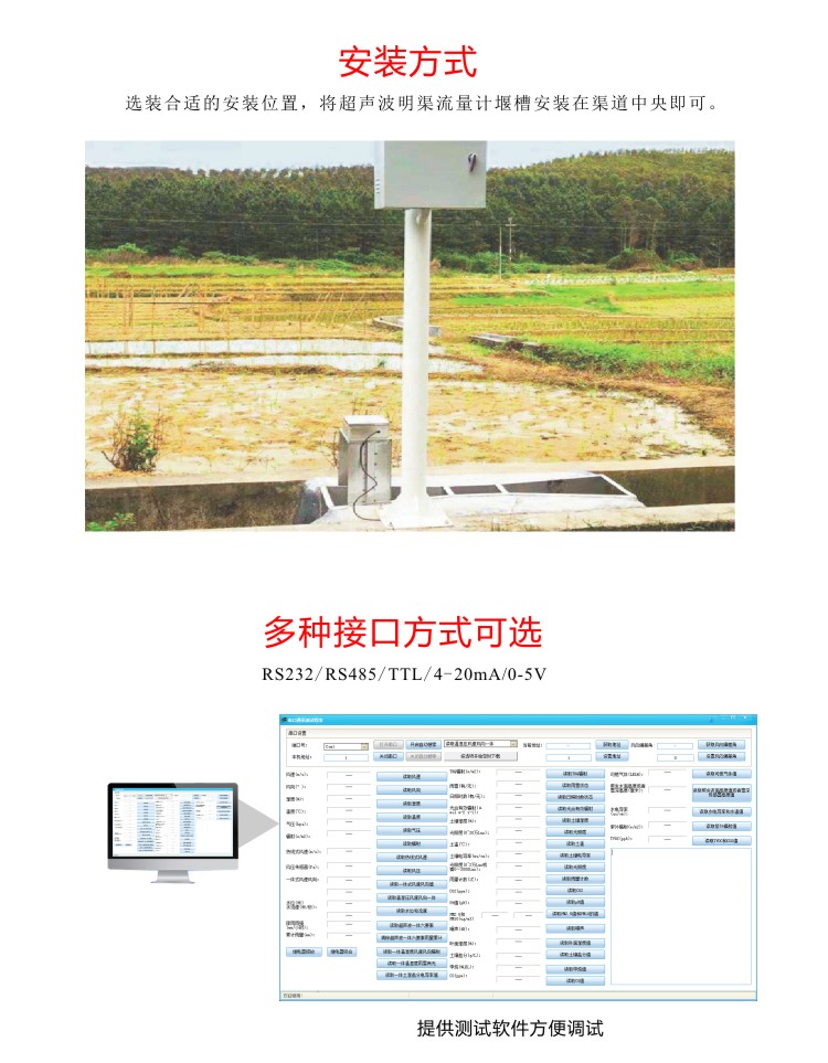 FY-YMLS超聲波明渠流量計,利用超聲波探頭非接觸測量方式測出渠道水位值,再通過水位-流量換算法計算出流量。可根據(jù)渠道現(xiàn)場情況搭配相應堰槽(巴歇爾槽、矩形堰、三角堰等)或不搭配堰槽單獨測量。主要應用在農(nóng)田灌溉渠道、企業(yè)排污口、污水處理廠、水電站生態(tài)下泄流量監(jiān)測等現(xiàn)場。