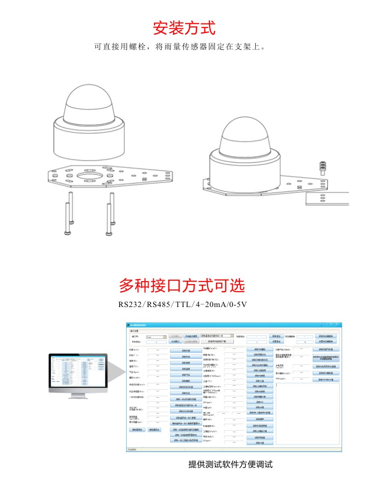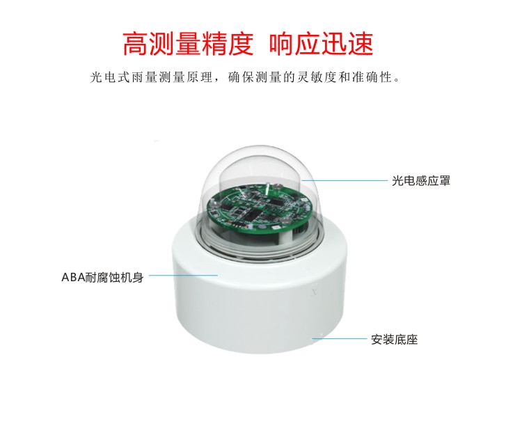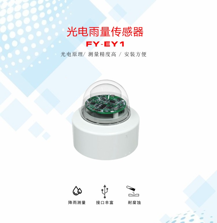 FY-EY1光電雨量傳感器內(nèi)部采用光學(xué)感應(yīng)原理測量降雨量,內(nèi)置多個光學(xué)探頭,雨量檢測可靠,區(qū)別于傳統(tǒng)的機械雨量傳感器,光學(xué)雨量傳感器體積更小、更靈敏可靠,更智能,易維護。
