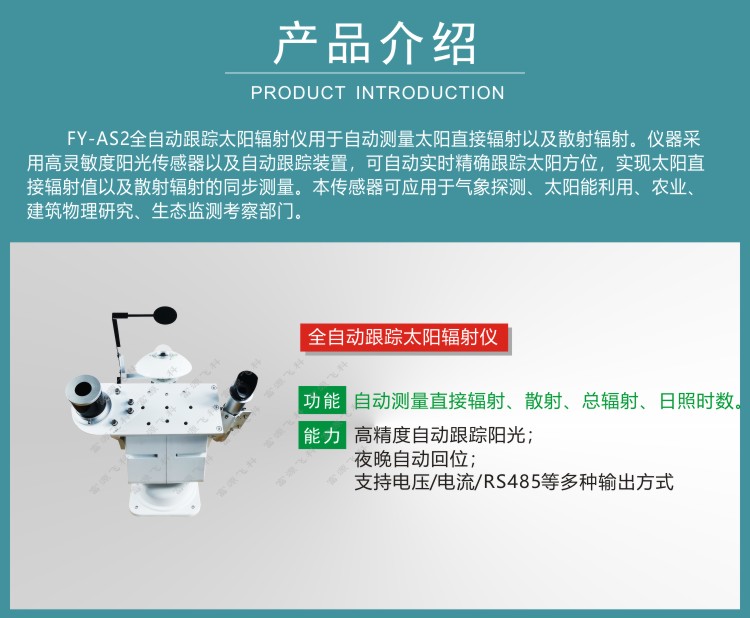 FY-AS2全自動跟蹤太陽輻射儀用于自動測量太陽直接輻射以及散射輻射。儀器采用高靈敏度陽光傳感器以及自動跟蹤裝置,可自動實時精確跟蹤太陽方位,實現太陽直接輻射值以及散射輻射的同步測量。本傳感器可應用于氣象探測、太陽能利用、農業、建筑物理研究、生態監測考察部門。