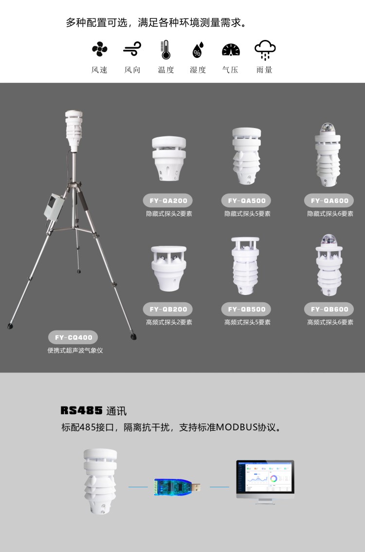FY-QA500超聲波5要素傳感器采用超聲波原理,一體式結(jié)構(gòu)可對風速、風向、溫度、濕度、氣壓等進行同步測量。采用高精度傳感元件作為感應部件,具有測量精度高、穩(wěn)定性好等特點,傳感器采用先進的電路集成模塊,可根據(jù)用戶的不同需求輸出RS232、RS485、4G等通訊方式傳輸。儀器體積小巧,安裝方便且便攜,性能可靠;可廣泛應用于氣象觀測、環(huán)境控制、農(nóng)業(yè)、工廠等諸多領域。