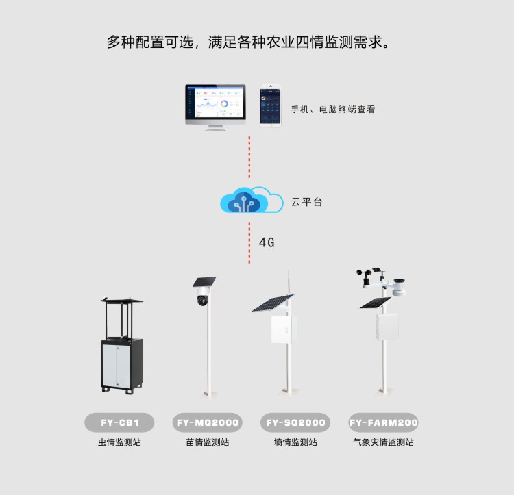 FY-FARM300系列農業氣象站,可對風速、風向、溫度、濕度、氣壓、雨量、光照、輻射、土壤溫濕度、鹽分、電導率、PM2.5等進行同步測量。采用進口傳感元件作為感應部件,具有測量精度高、穩定性好等特點,傳感器采用先進的電路集成模塊,可根據用戶的不同需求輸出RS232、RS485、4G等通訊方式傳輸。儀器體積小巧,安裝方便且便攜,性能可靠;可廣泛應用于氣象觀測、環境控制、農業、工廠等諸多領域。